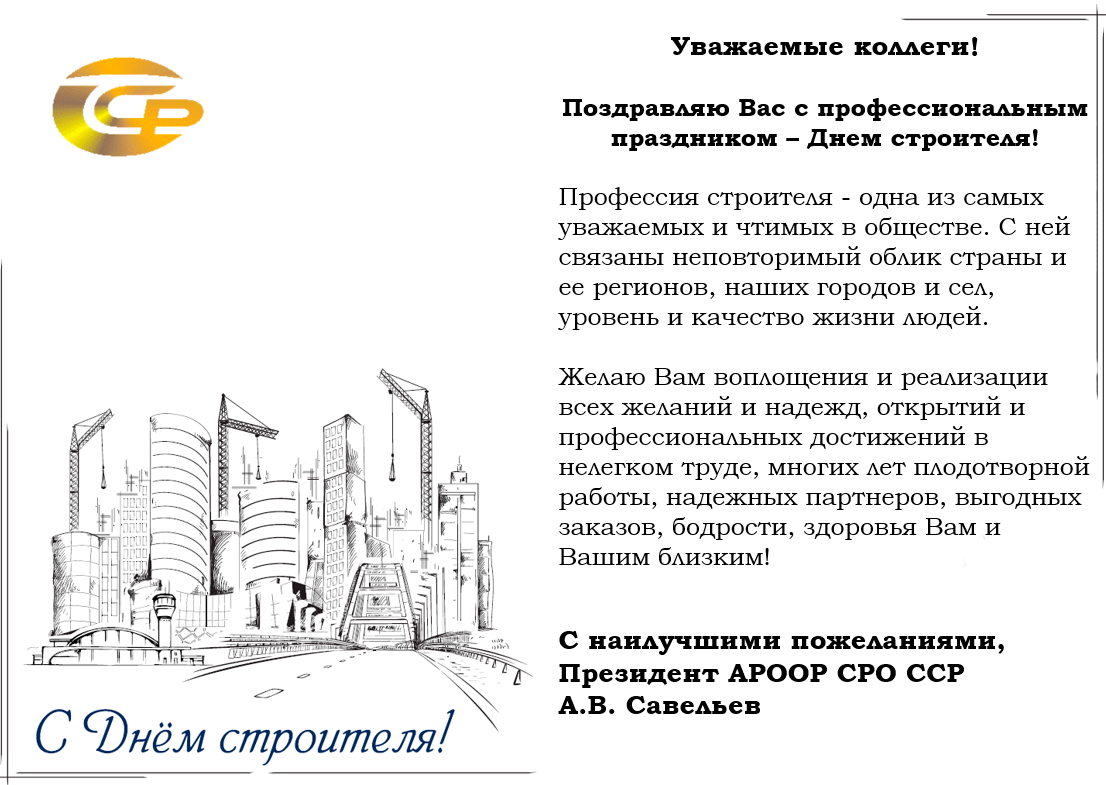 Президент АРООР СРО ССР Савельев А.В. поздравляет строителей с профессиональным праздником